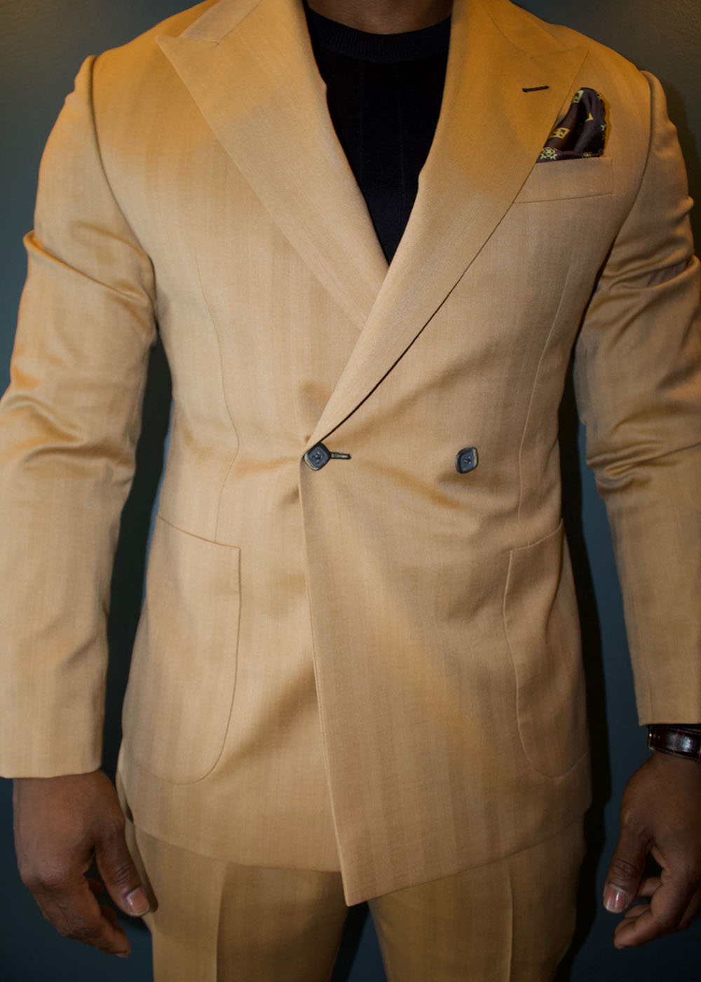 The Gold Finger Suit is a masterclass in modern tailoring. Cut in a sharp double-breasted silhouette, it features a wide peak lapel that projects authority, while square horn buttons with extended accented buttonholes deliver a statement of craftsmanship. The raised Gurkha waistband offers a distinctive edge, combining heritage inspiration with contemporary refinement. Designed in a tapered fit, this limited edition suit is made to define presence at the highest level of sophistication.